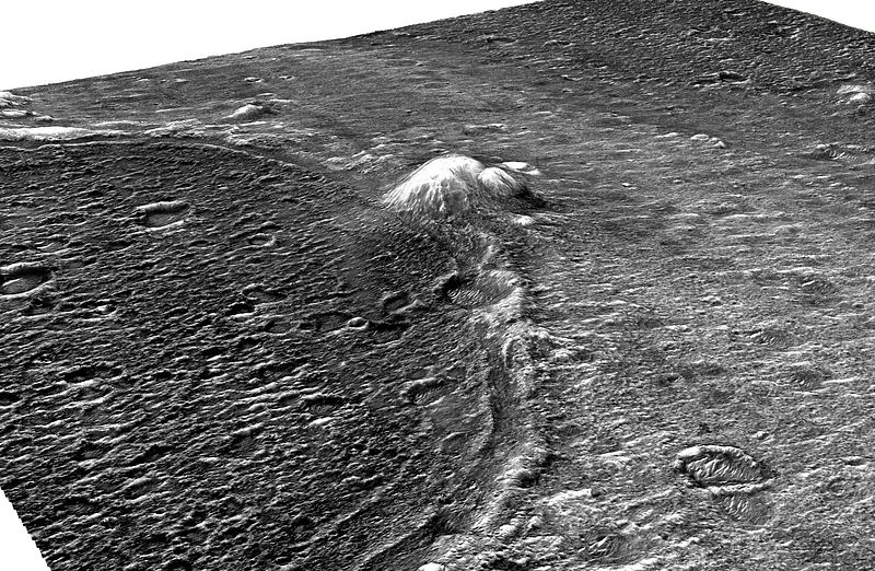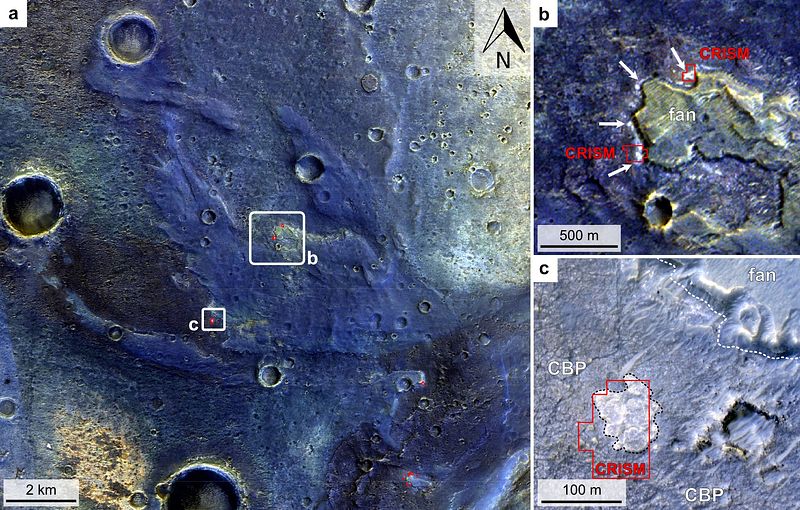 Oxia Planum's sedimentary fan, which contains bright-toned outcrops of hydrated silica at its base.